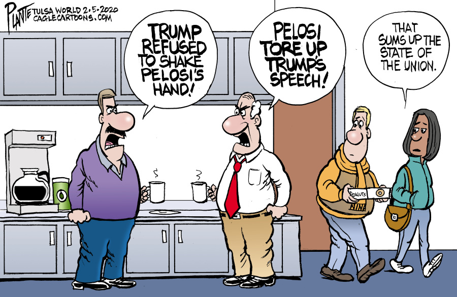 The speaker in this cartoon are the two guys that are talking to each other about the state of union speech and also the couple that walked by and made a comment. The occasion would be what went down during the state of union speech between Donald Trump and Nancy Pelosi. The audience would be congress and the secondary audience would be everyone else who tuned in and watched the state of union speech. The purpose of this cartoon was to inform people of what happened during that speech between Trump and Peolsi. The secondary purpose would be to exemplify and make fun of what most people talked and argued about after the speech. What I got from the cartoon was that I thought it was funny since the couple that walked by stated that is how America looks right now, by referring to the two guys arguing. Which represents how Americans always argue and exaggerate things to get their point across. The cartoon is in an office space, which shows that even people at work are arguing and talking about what happened during that speech and whose actions were justified. The cartoon even pokes more fun at America through the guy carrying a donut box and the typical office setting with two white men dressed